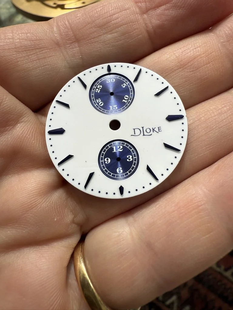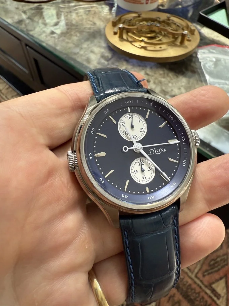 The dial on his personal watch is a mesmerizing blue — shifting hue in different light. Another version features a white lacquer enamel dial (not fired in the kiln like a Grand Feu, but applied in multiple coats), with blue subdials and blue steel baton markers. Don showed me a loose dial from this variant, which was elegant and distinctive, with concealed pushers for chronograph operation.