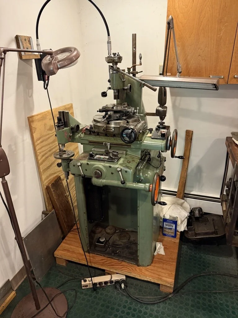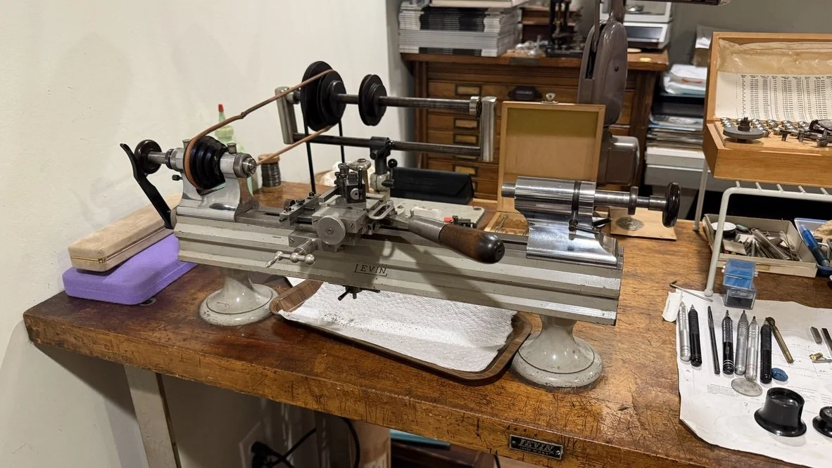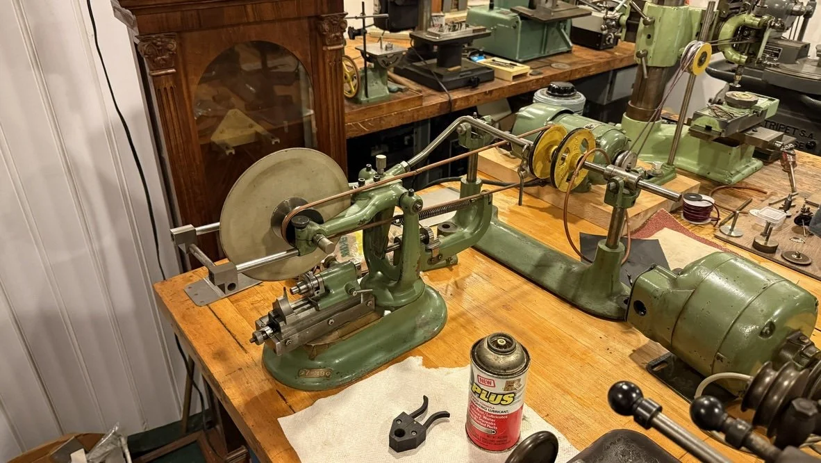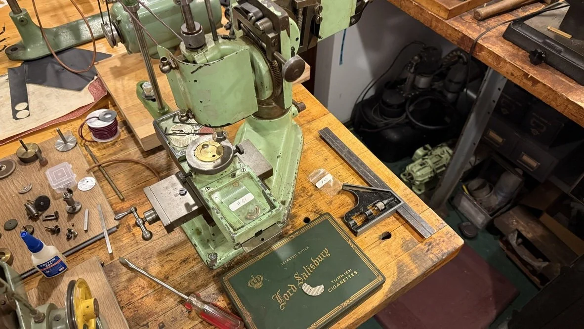 He then showed me a curious mystery machine he’d purchased without knowing its purpose. Don suspects it’s used for damascening — the decorative surface finishing once seen on vintage American pocket watch bridges — though he’s still figuring out exactly how it operates.