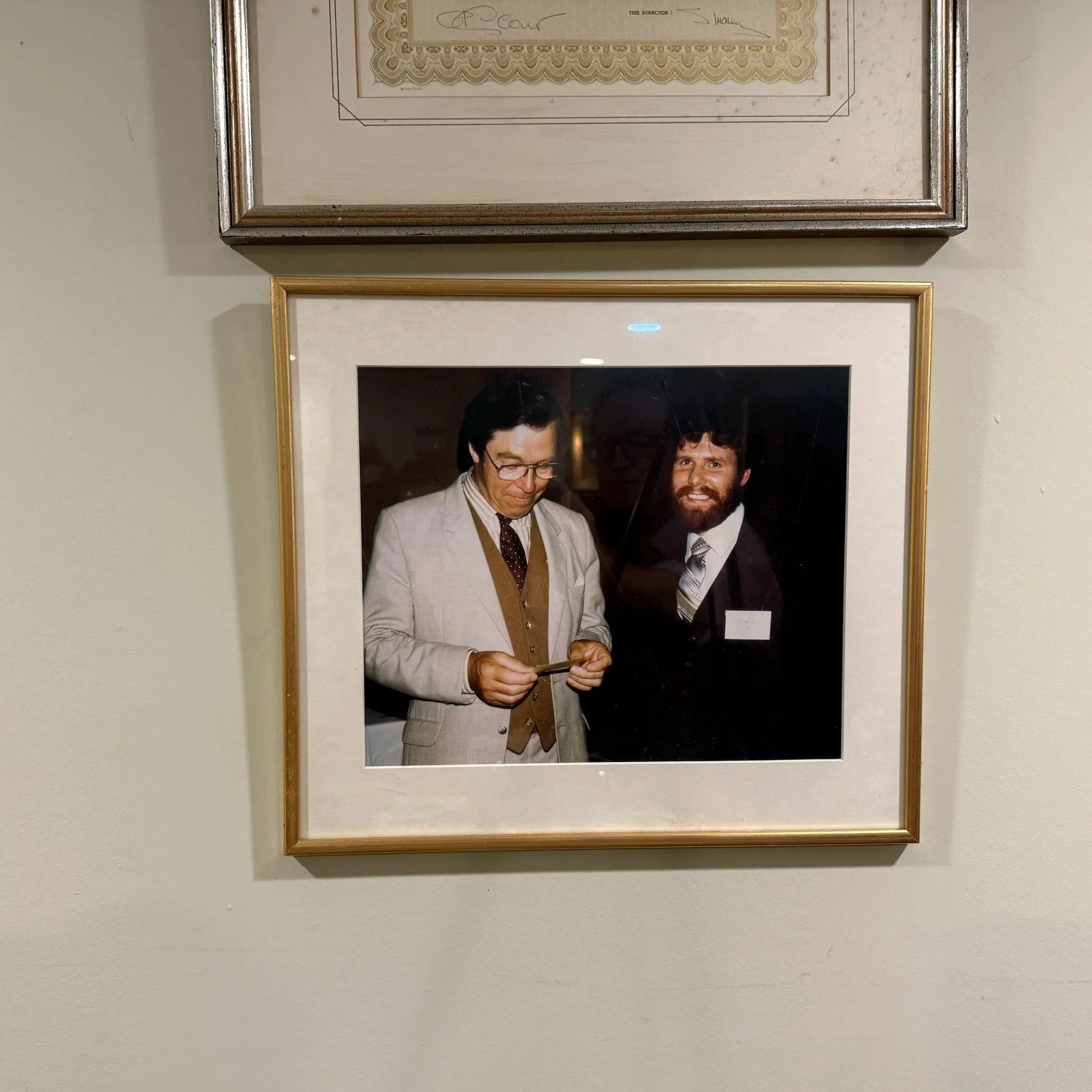 Mounted above one workbench was a photograph of a young Don Loke with George Daniels, likely from the 1980s. Above it hung his WOSTEP certificate, earned in Biel, Switzerland in 1984 after completing an advanced course in Swiss horology.