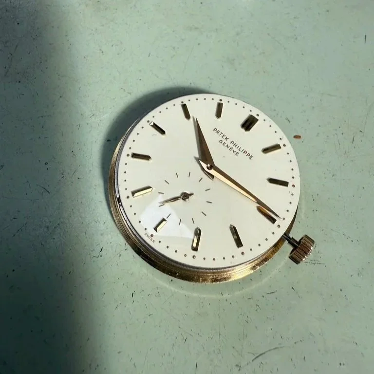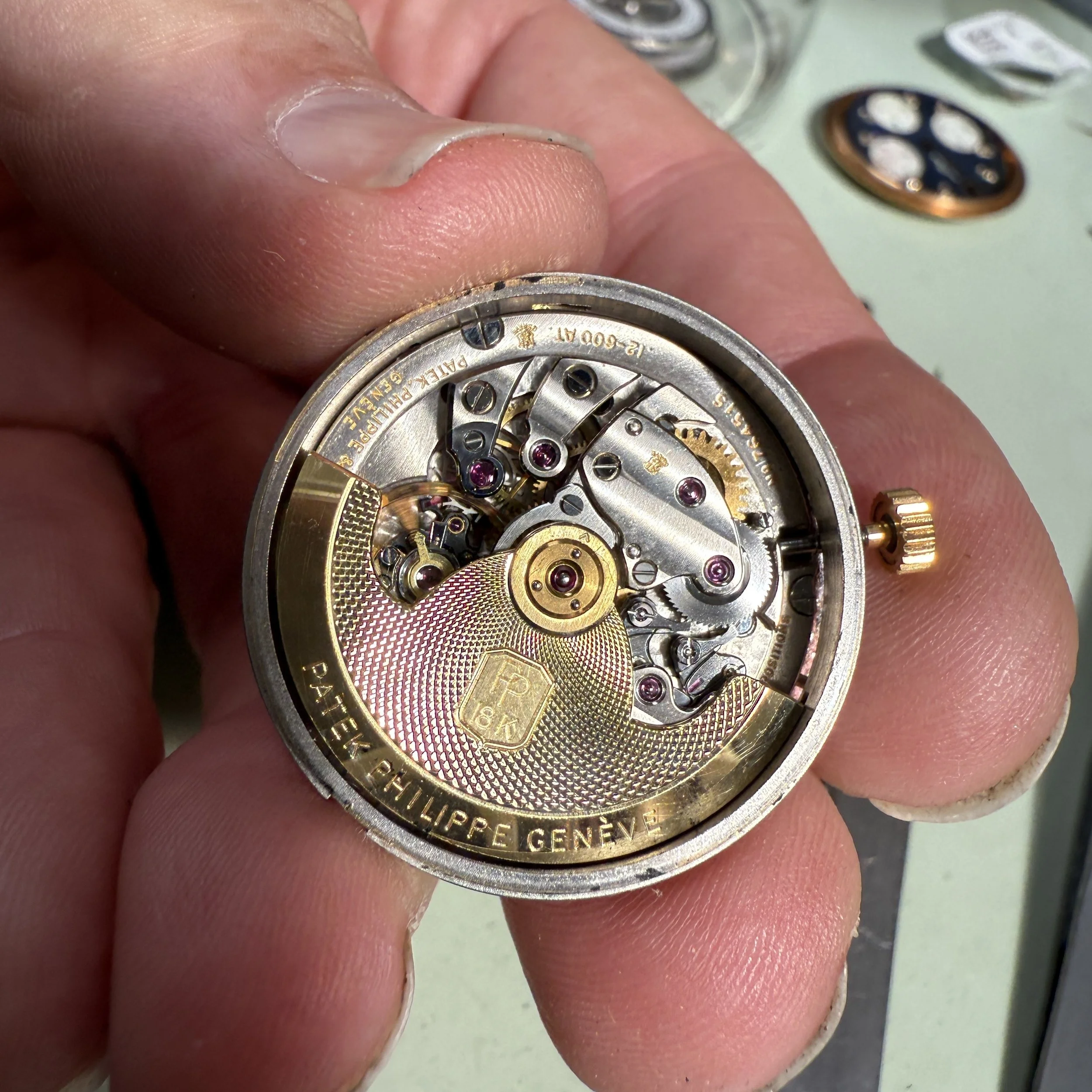 Another fascinating piece on his bench that day was a Patek Philippe Calatrava Ref. 2526, recognizable by its ivory enamel dial and the automatic caliber 12-600 with its guilloché 18k yellow gold rotor.