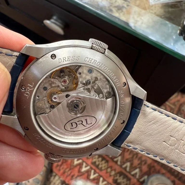 He calls it simply the “Dress Chronograph.” The case is made from titanium, and inside beats a chronometer-rated Concepto 7750-derived caliber that Don reworks and finishes to his own standards.
