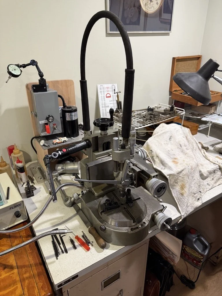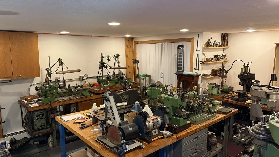 This is the workshop that allows Don to restore, repair, and rejuvenate nearly any traditionally made mechanical watch or pocket watch. Alongside the Hauser mill were his Schaublin 102 and Schaublin 70 lathes — instruments capable of precision down to one micron, enabling Don to craft parts to exact tolerances.