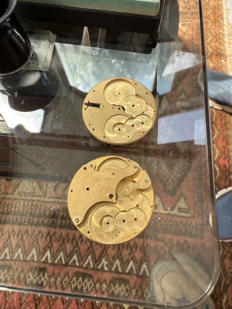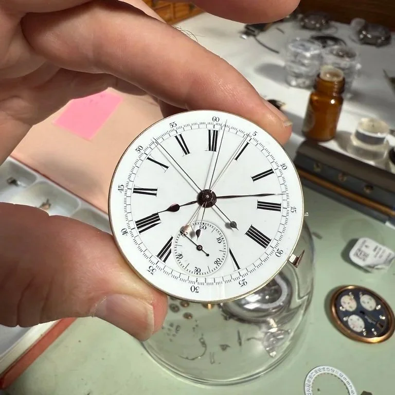 Under a glass dome sat an elegant and highly complex pocket watch caliber. Don lifted the dome and handed me the movement, asking what I thought of it. The piece was strikingly three-dimensional — and when he turned it over, revealing the dial side, I realized I was looking at something extraordinary: a triple chronograph, probably made between 1900 and 1910, with three central seconds hands in blue, purple, and polished steel.