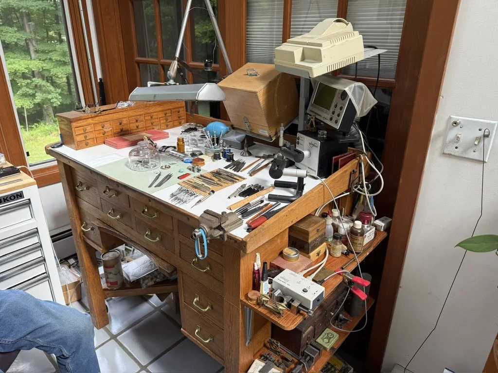 When we arrived at his home, the first stop was his workbench — a beautiful wooden bench made by an Amish craftsman. Don had purchased it from one of his mentors, paying it off slowly over several months in hundred-dollar installments. On it lay the familiar tools of a master watchmaker.