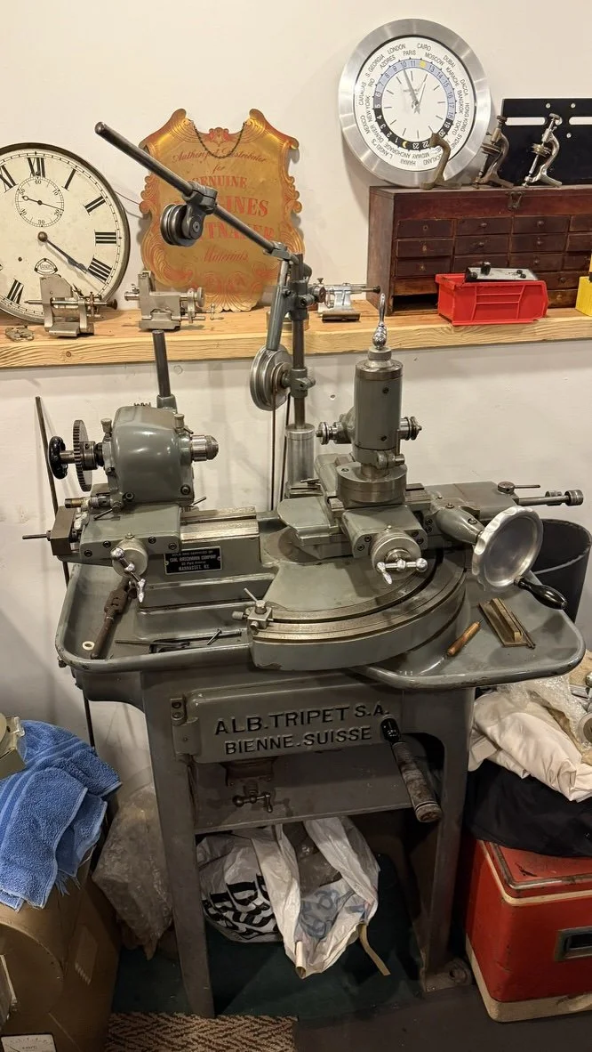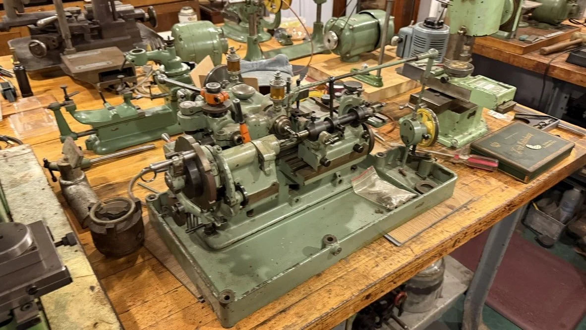 We then headed downstairs to what I term the garden garage — a workspace filled with traditional watchmaking machinery he’s collected over his career. It’s one of the most complete private workshops I’ve ever seen, full of older, often historic machines I’d never encountered before.