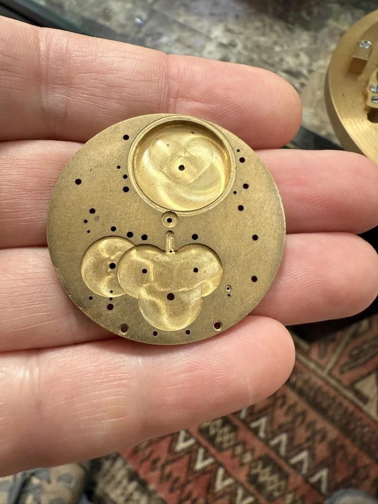 He showed me the raw brass main plates and bridges of the lever-caliber design, still unfinished but beautifully proportioned.